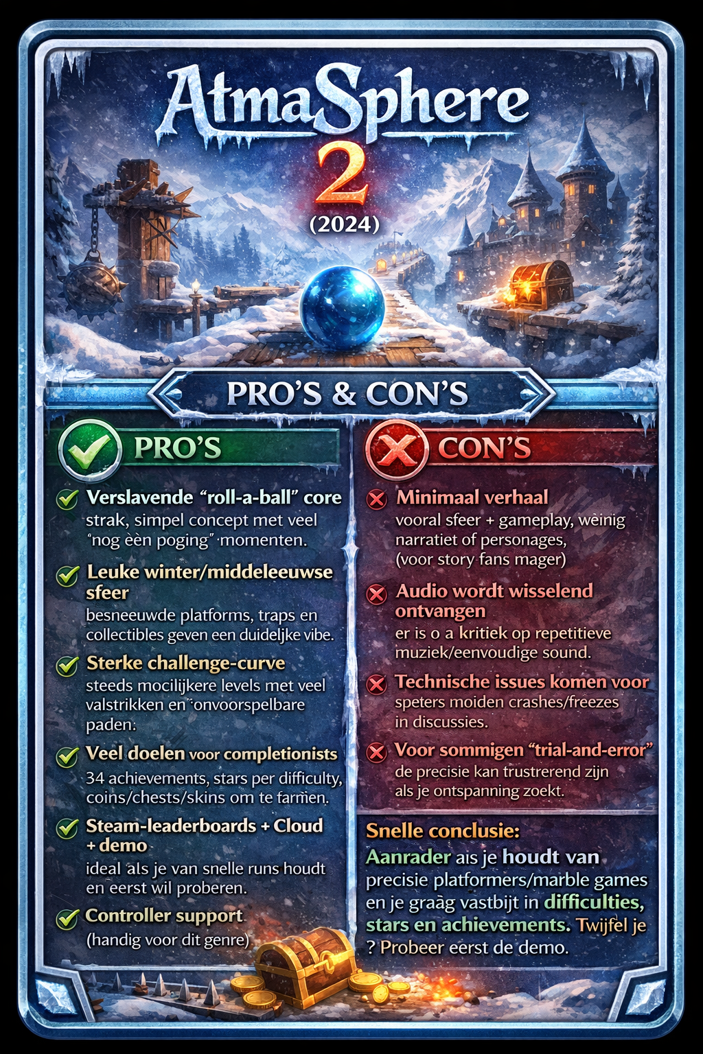 Een leuke, rechttoe-rechtaan skillgame met een koude middeleeuwse vibe en veel uitdaging, maar met kleine indie-randjes (met name stabiliteit bij sommige spelers). Als je twijfelt: start met de demo. (Steam Community)
