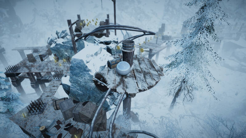 In screenshots zie je vooral besneeuwde platforms met hout/steen-materialen, middeleeuwse props (zoals vaten, kratten, kruiken, banieren) en veel hoogte + afgronden in een koude, mistige omgeving.